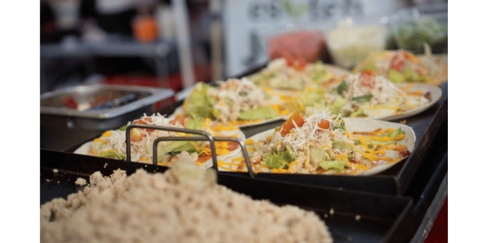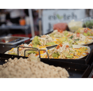 Isian taco berupa daging ayam cincang, sayuran, dan keju ditata di atas tortilla chips pada wajan panas sebelum disajikan kepada pembeli (10/03/2026).